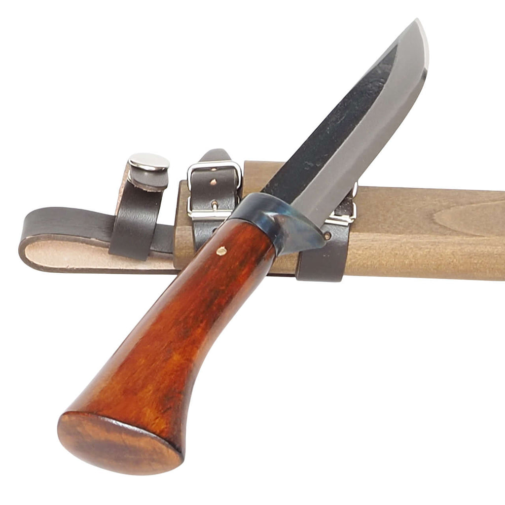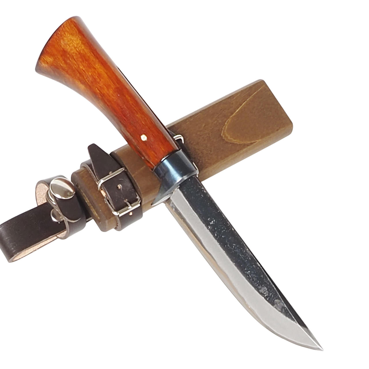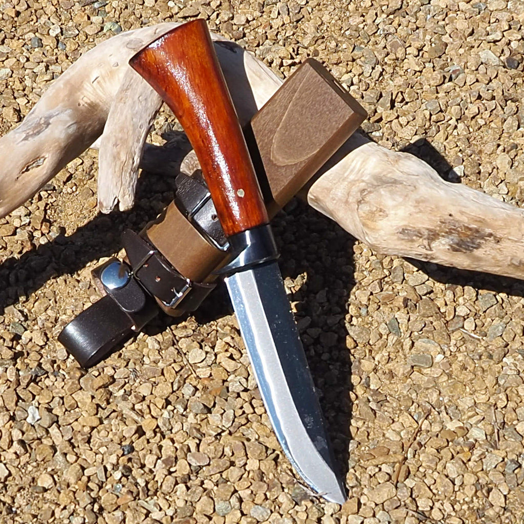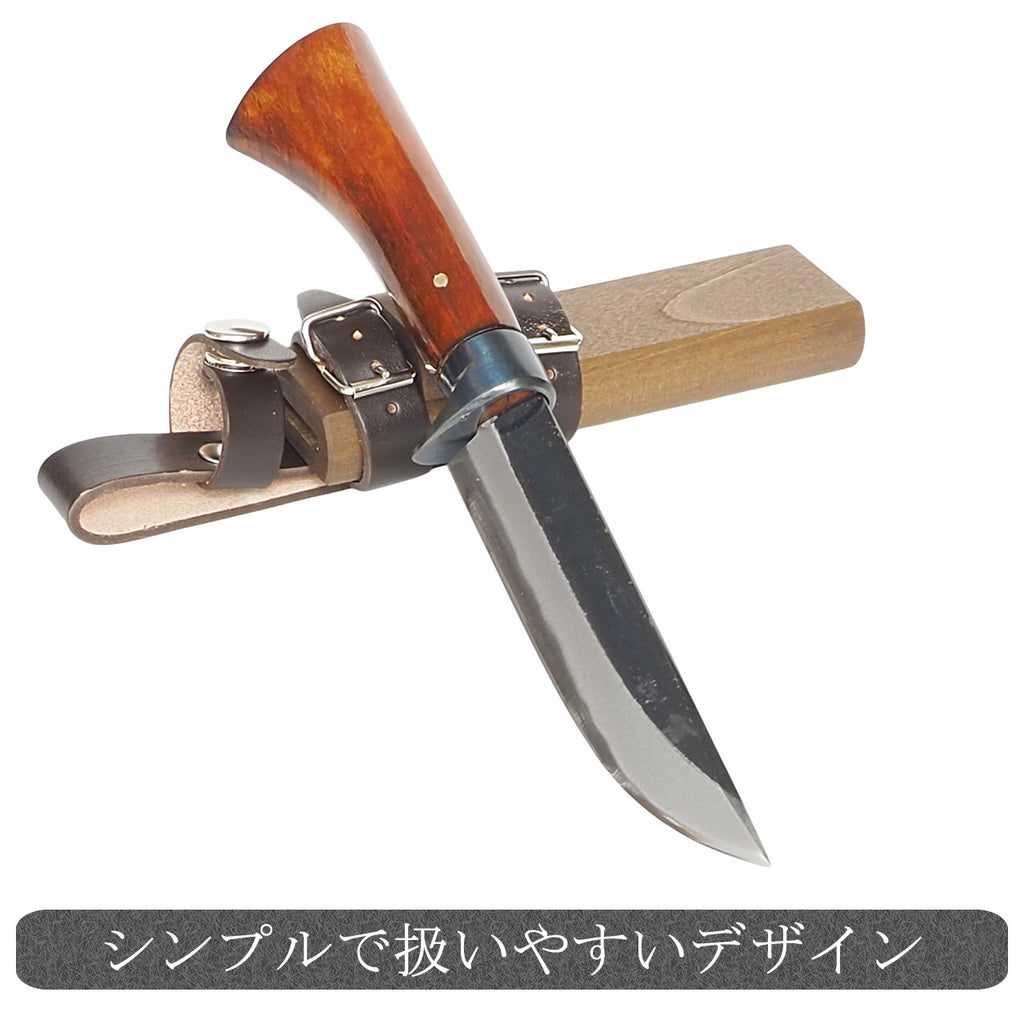 留め具でナイフをしっかりと収納でき、ベルト通しも付いているので、腰につけての移動も楽に行えます。
