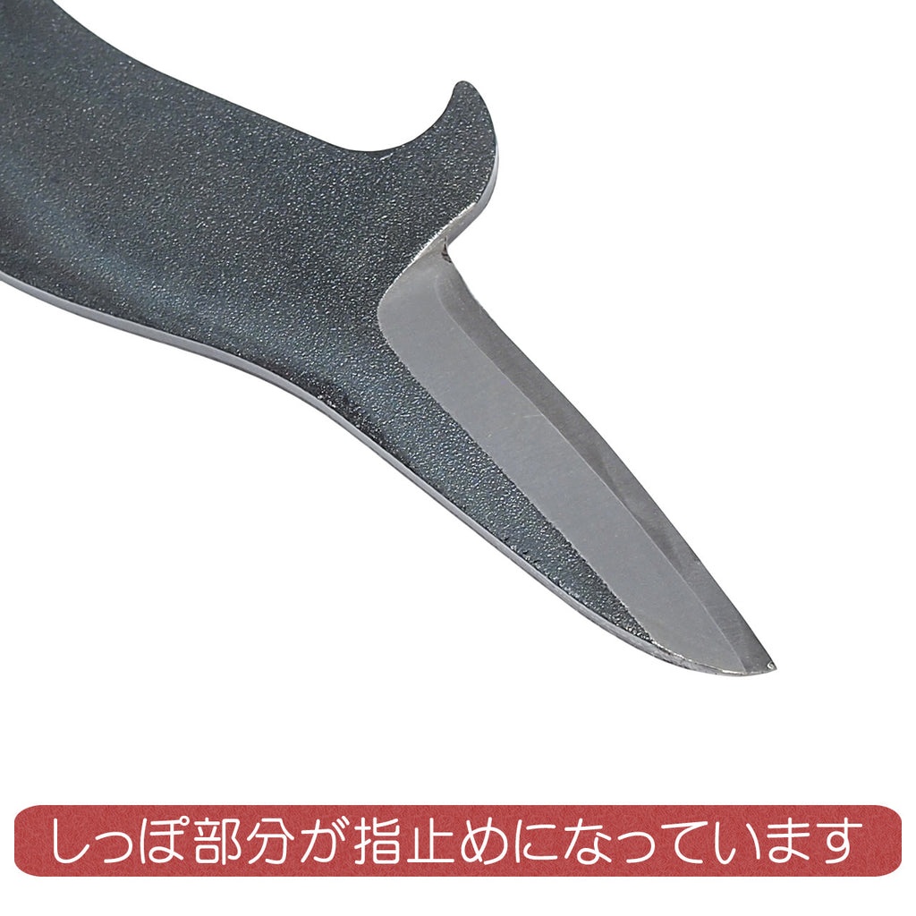 持った時に背中とお腹のカーブがすっと手に馴染む形状、しっぽがストッパーになっているので滑って手を切る心配もありません。